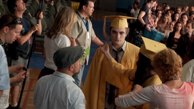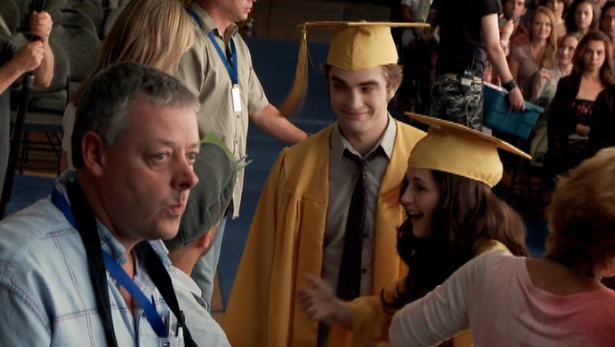 Alerta fofura! Kristen brincando com o chapéu de graduação de Rob em Eclipse